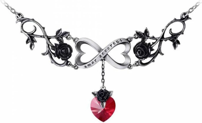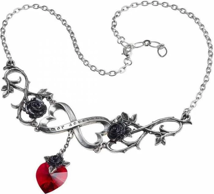 A three section, articulated pewter necklace with a polished, double heart-shaped knot of infinity at the centre and a woven black rose motif on either side. From the central section hangs a deep red Swarovski crystal heart, suspended on a fine black chain terminating in a black rose bale.