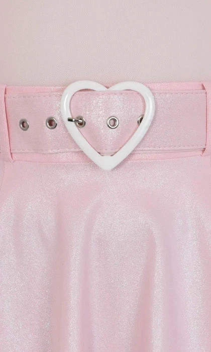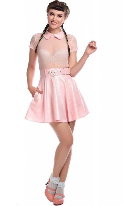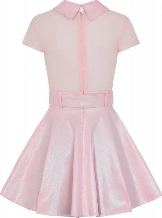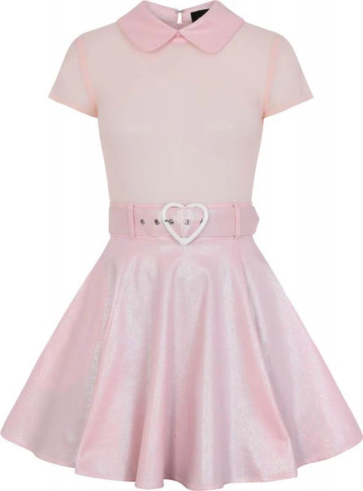 The Adore Glitter Skater Dress is an Adorable pastel piece! She’s both cute and a little bit daring, perfect for your fun, weekend mode! Her upper half is a super stretchy, sheer pink mesh, with sweet sleeves, and classic Peter Pan collar, made from a contrasting glitter coated bengaline fabric in a matching shade. Her mini skater skirt is also made from this fun fabric, with handy side seam pockets, and a covered belt with a white, marble-effect heart shaped buckle and metal eyelets and spoke.