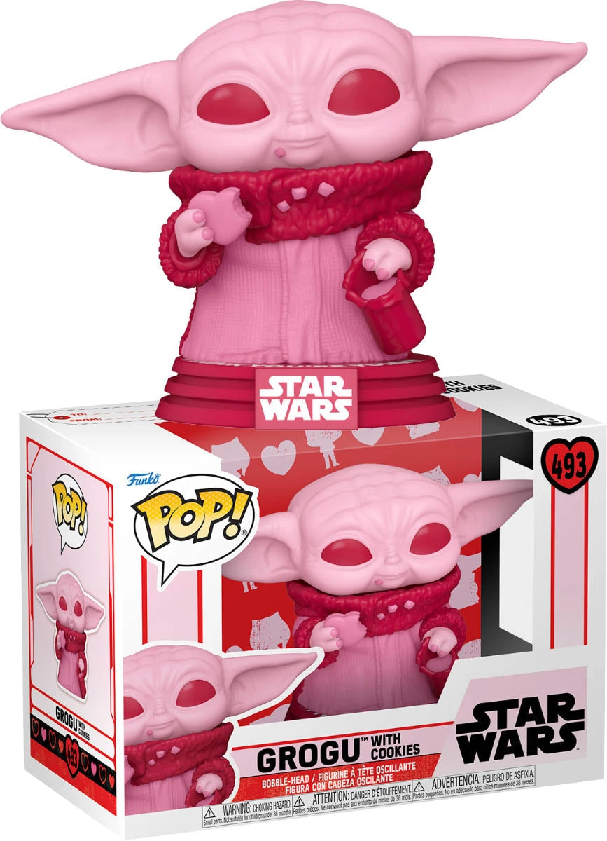 This Pop! features the Baby Yoda himself, Grogu, who is chowing down on some delicious heart-shaped cookies.