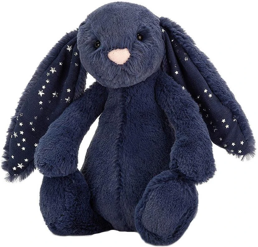 Bashful Stardust Bunny is a shy little sweetheart with yummy-soft midnight fur. Flopsy and gentle in deep navy blue, this bobble-nosed bunny loves bedtime so much. With sparkling ears full of twinkling silver stars, Bashful Stardust Bunny is a dreamy buddy.