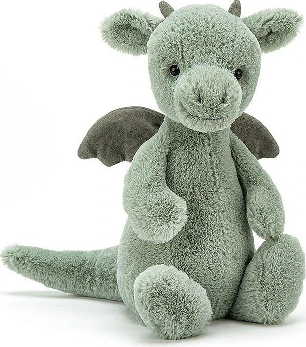 Bashful Dragon is a fierce little friend, with plenty of attitude! With super soft fur in pale sage green, suedey horns and a long, squidgy tail, this brilliant beastie is pretty fantastic. We love those neat little contrast wings, chunky feet and fine flappy ears – what a legend!