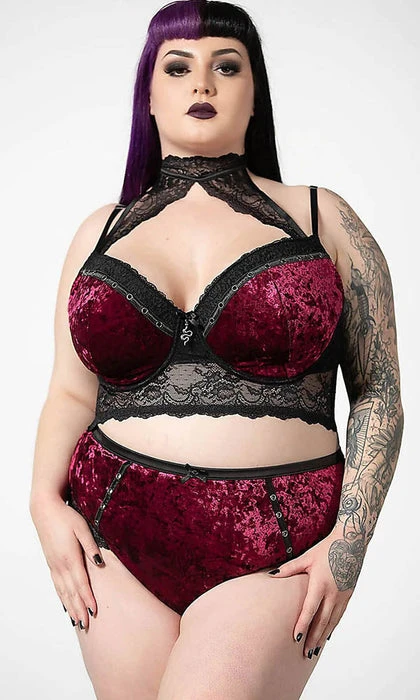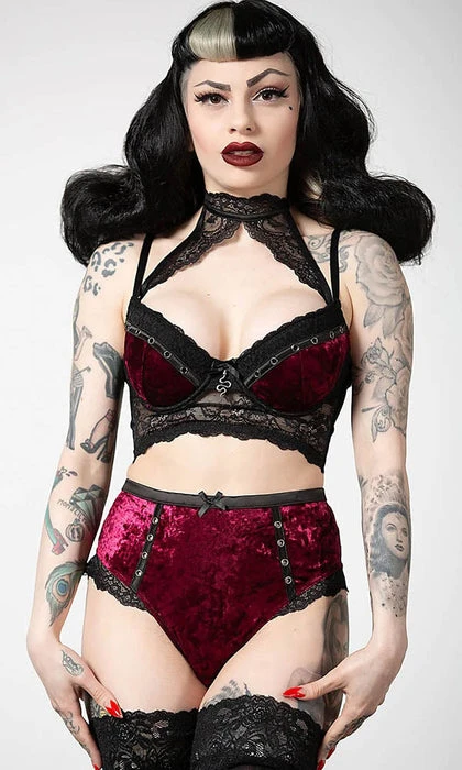 Make them beg for your attention in the ‘Mercy’ bra. Crafted in soft luxe velvet with lightly padded cups and adjustable, elastic straps for the perfect fit. Metal rivet details, snake charm and lace collar detail this bra is perfect for play dates with the devil, dancing barefoot under the moon or a coven sleepover.