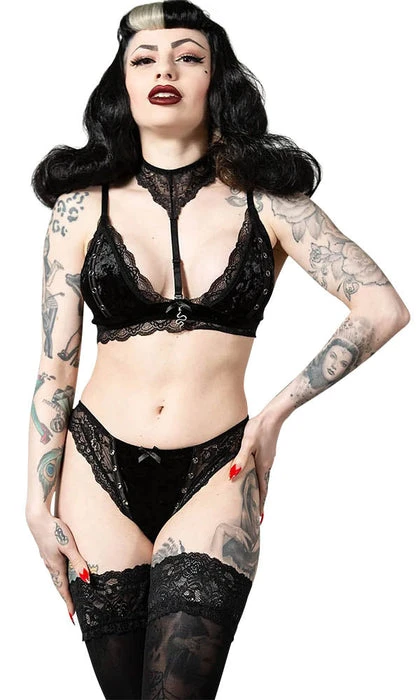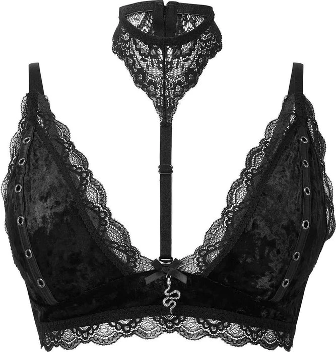 Possess all of the powers in the ‘Pin Stuck’ bra. Crafted in soft, velvet fabric with lace trim and a detachable lace collar it’s finished with metal rivet details and a metal snake charm. Perfect for seducing the demons or making yourself feel fierce.