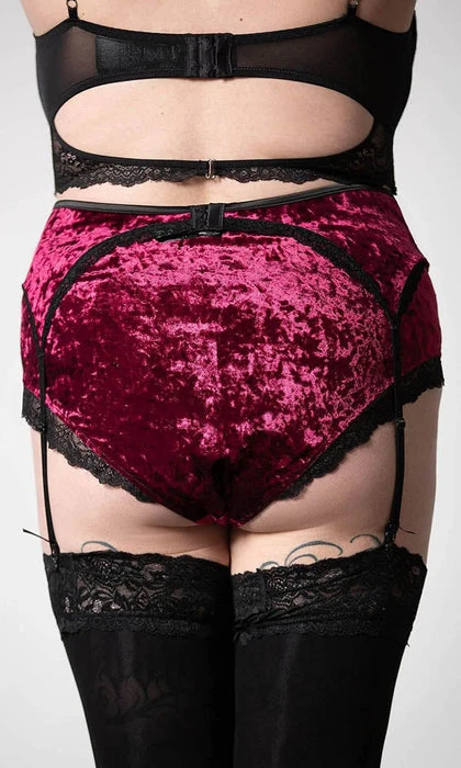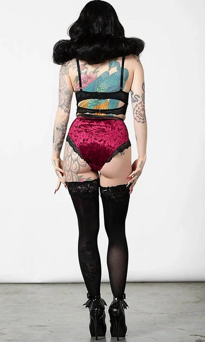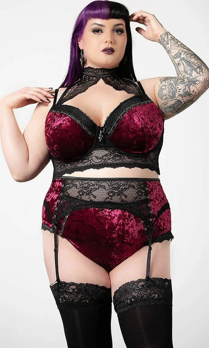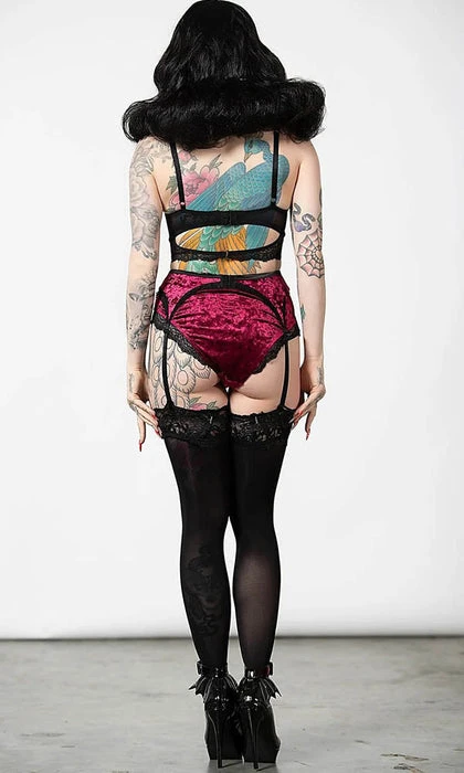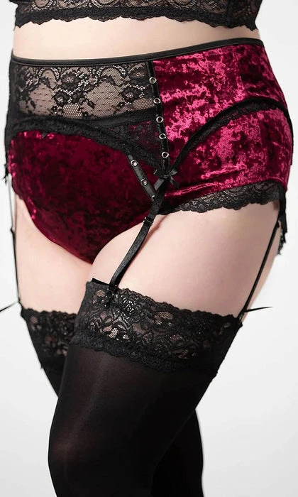 Make them beg for your attention in the ‘Mercy’ lace garter belt. Crafted in soft stretch, luxe velvet with lace trim and finished with metal rivet details and adjustable suspender straps. Perfect for play dates with the devil, dancing barefoot under the moon or a coven sleepover.