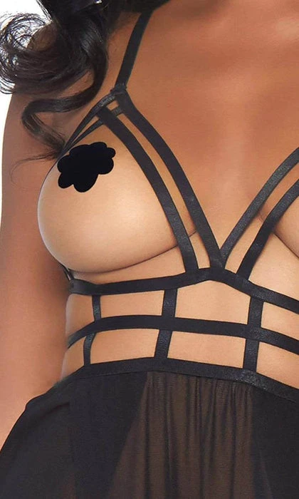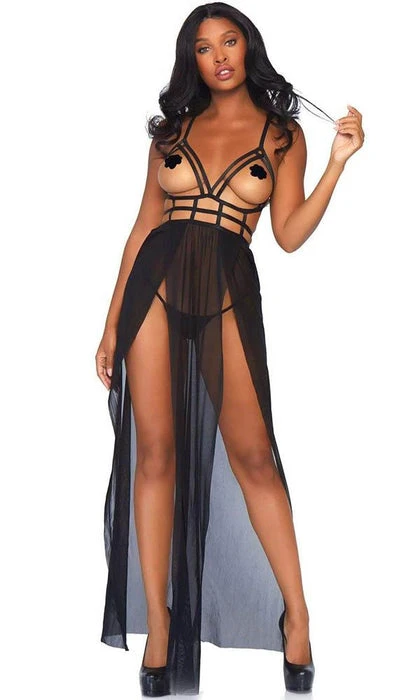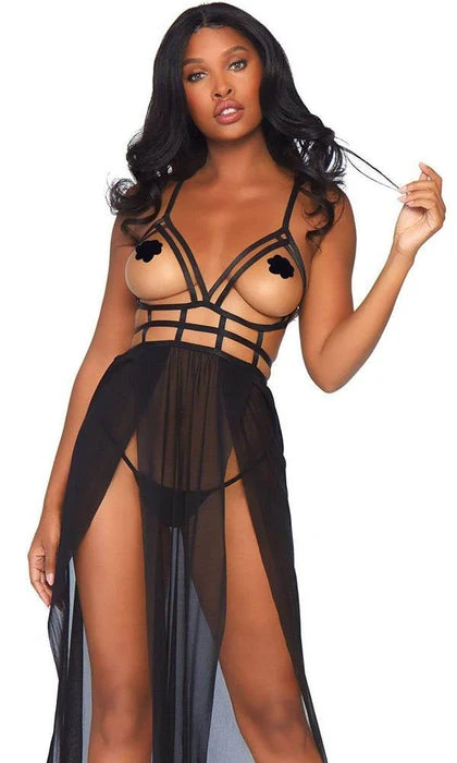 Entice them in this daring lingerie gown set by Leg Avenue, featuring a sexy sheer dress with cage strap bodice open cups, strappy bare back, dual slit sheer skirt, and matching thong panty. This hot lingerie dress can take you from the bedroom to poolside as a daring bikini coverup or add to your sex appeal by pairing this sheer lingerie look with thigh highs.