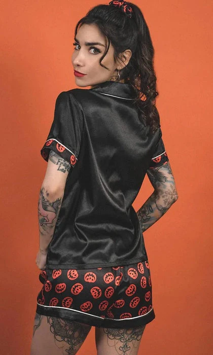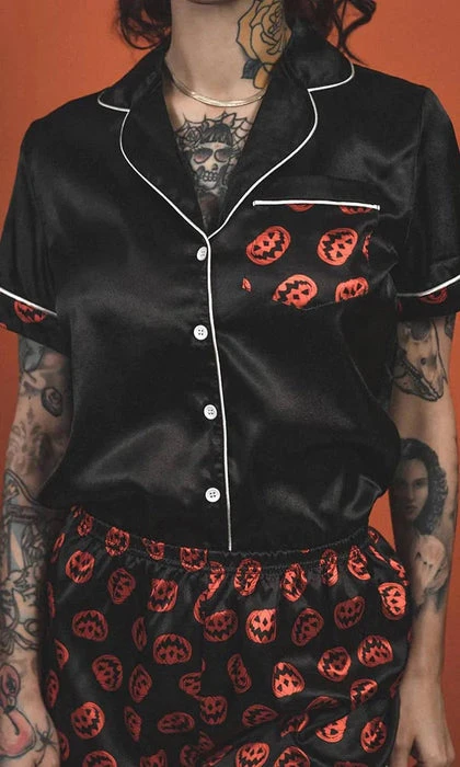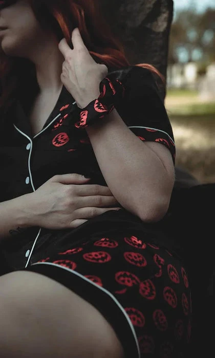 Front: Black + Haunted Hallows repeating fabric. Top ~ oversized button-up bodice, accented with a patch pocket.
