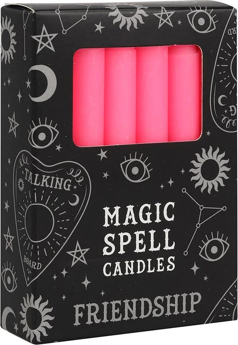Beautiful pack of 12 pink candles for casting spells that bring you friendship and emotional well-being. Each candle in this witchy box measures approximately 4″ and has a white wick. A great gift for yourself, or for the witch in your life. Burn the candle completely for the spell to be complete.
